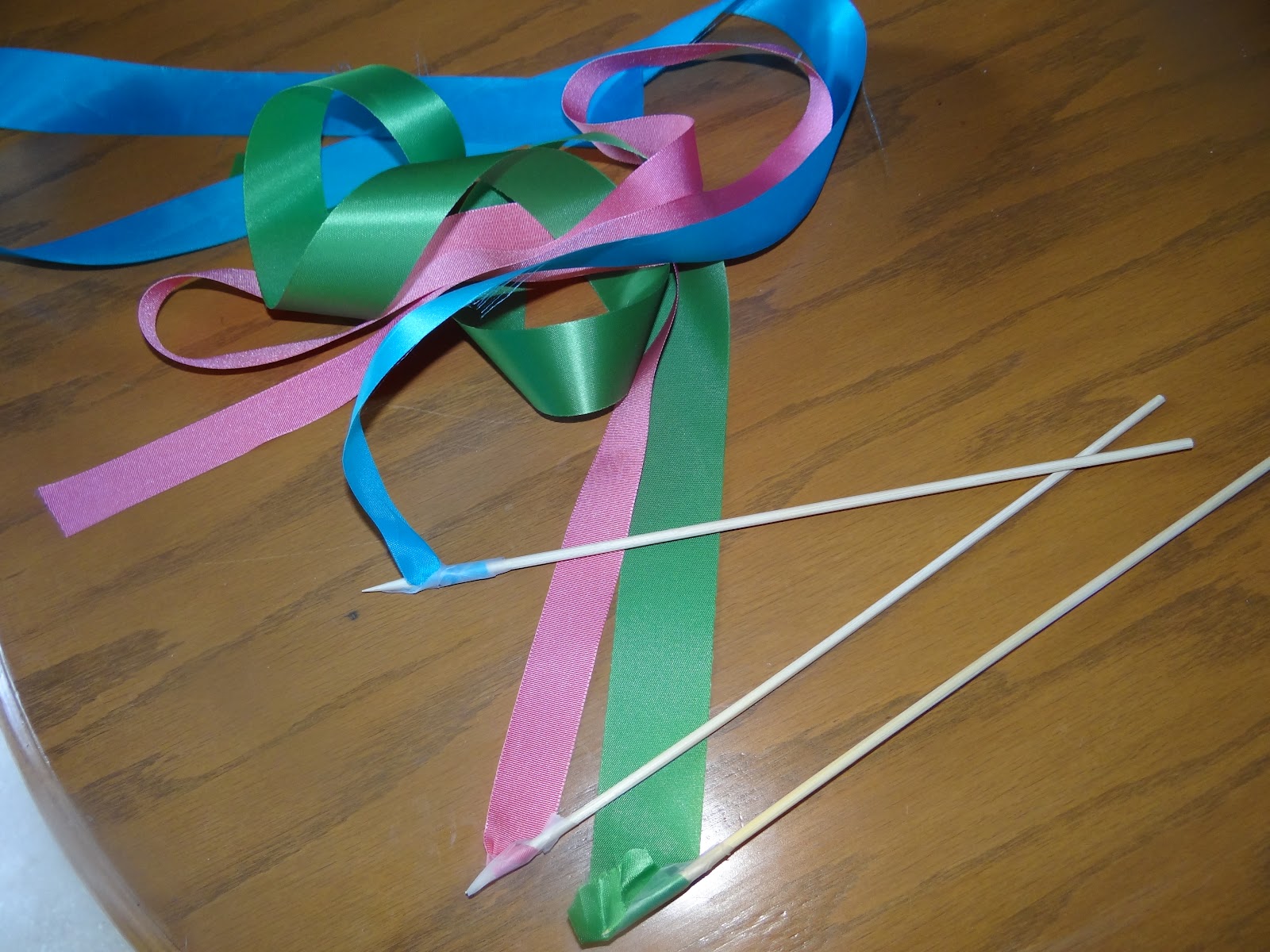 I just taped the ribbons on to some wooden skewers I had gotten from the Dollar Store. Or you could use chopsticks. You’d only need 3 pairs. I bet Pei Wei or Panda would give them to you FREE! |