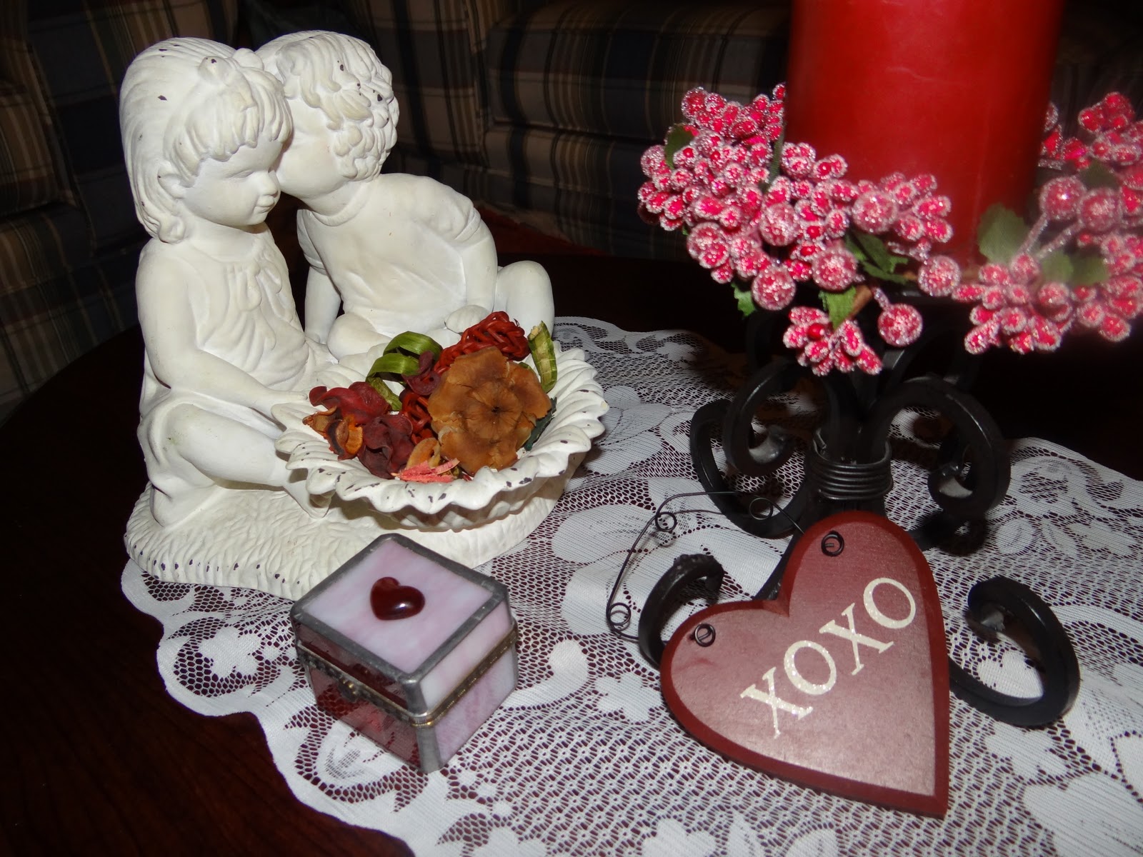 It’s amazing how much stuff you can accumulate when you go shop the after holiday sales for a few years……I got lots of cute stuff for just a dollar or two. This is my coffee table…..I love this little stained glass heart box…. |