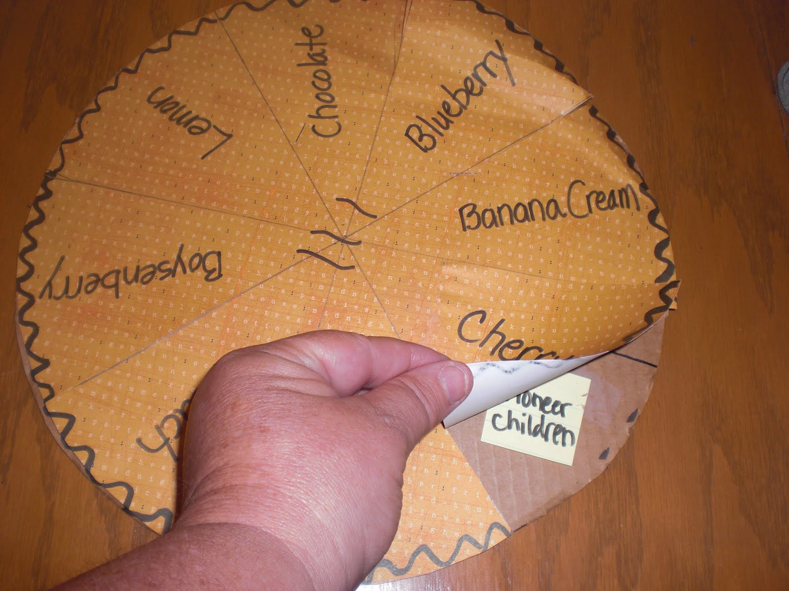 I made a little pie chart with 8 different kinds of pies on the top listed; banana cream, blueberry, chocolate, lemon, etc. and the kids would come up and choose their favorite pie. I cut slits on either sides of the pie pieces but left about 2 inches up at the middle uncut, so the pie would stay together. Underneath each pie piece was a song we needed to practice mixed in with 4 pioneer songs from the songbook.